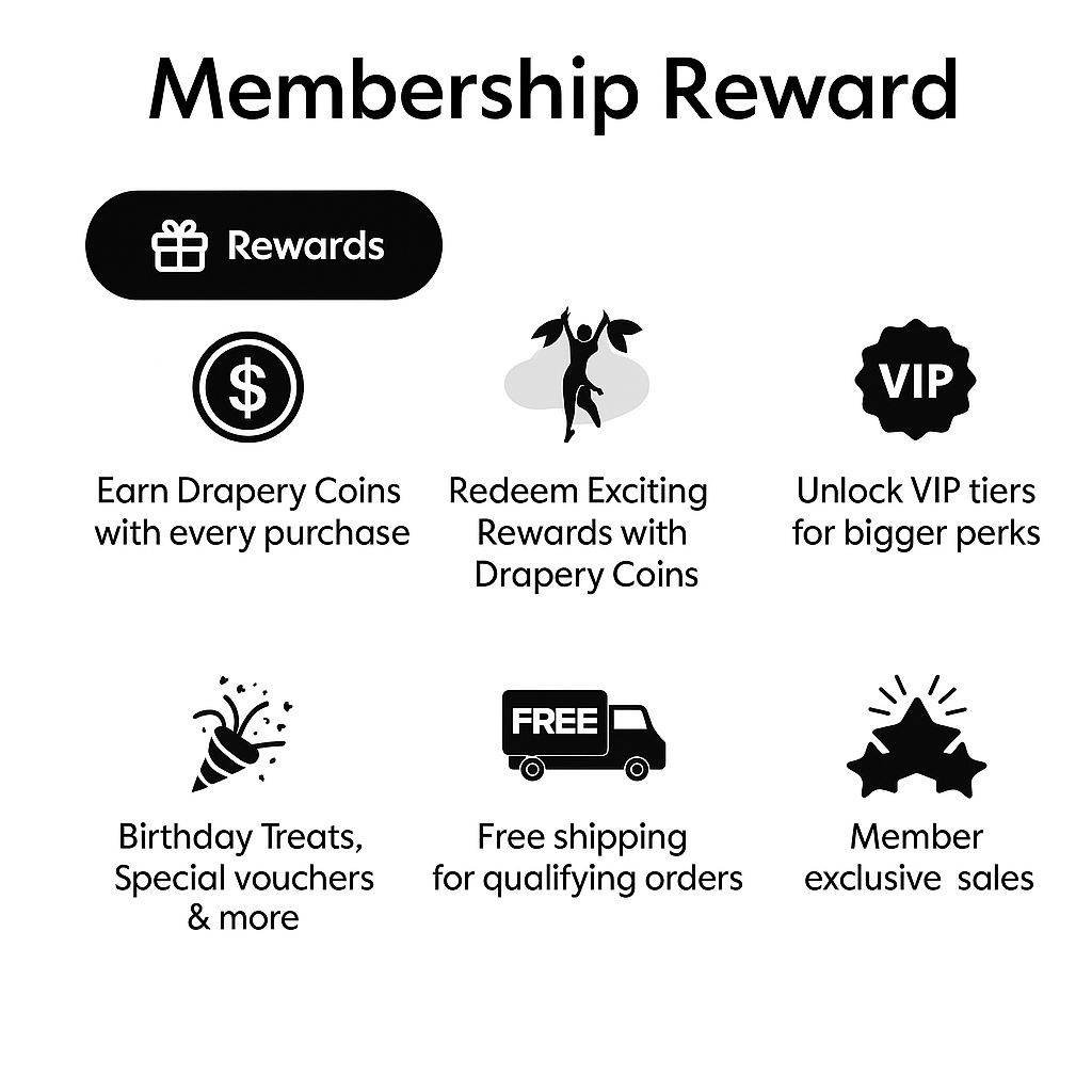 As a member, you’ll instantly gain access to a host of exclusive benefits designed to make your shopping more enjoyable and cost-effective. You’ll earn 1 Drapery Coin for every RM1 spent, with higher tiers potentially earning even more. Bonus coins may also be awarded during promotional campaigns or by completing specific actions such as sharing on social media, writing a review, or referring a friend. On top of that, enjoy member-only discounts, early access to new arrivals and promotions, and thoughtful birthday surprises, all while collecting Drapery Coins with every purchase.